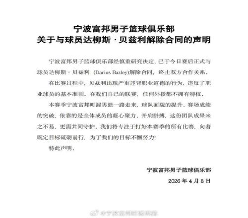 然而谁也想不到,在仅出战55秒的情况下贝兹利出现了不尊重比赛、不尊重队友和教练组、管理层等一系列问题,加上个人赛季表现一般,宁波队赛后第一时间与其解约也就不意外了。